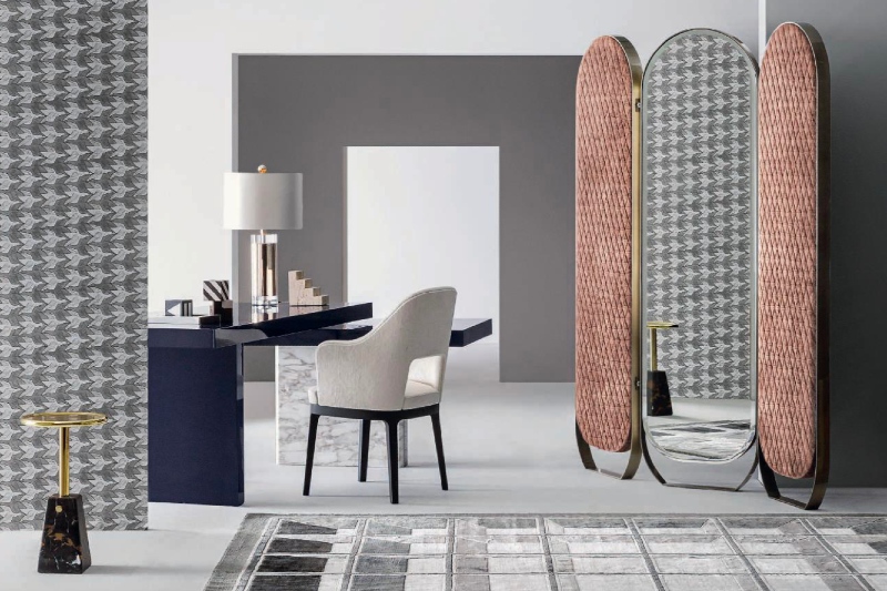 The RUIN RUG pairs especially well with the NAU SOFA. The curved shape of the back of the sofa paired with its soft velvet cotton texture creates a relaxing ambient that is ideal to rest in after a long day. The SHINTO CENTER TABLE brings a little bit of contrast with its monochrome colors and sleek design.
