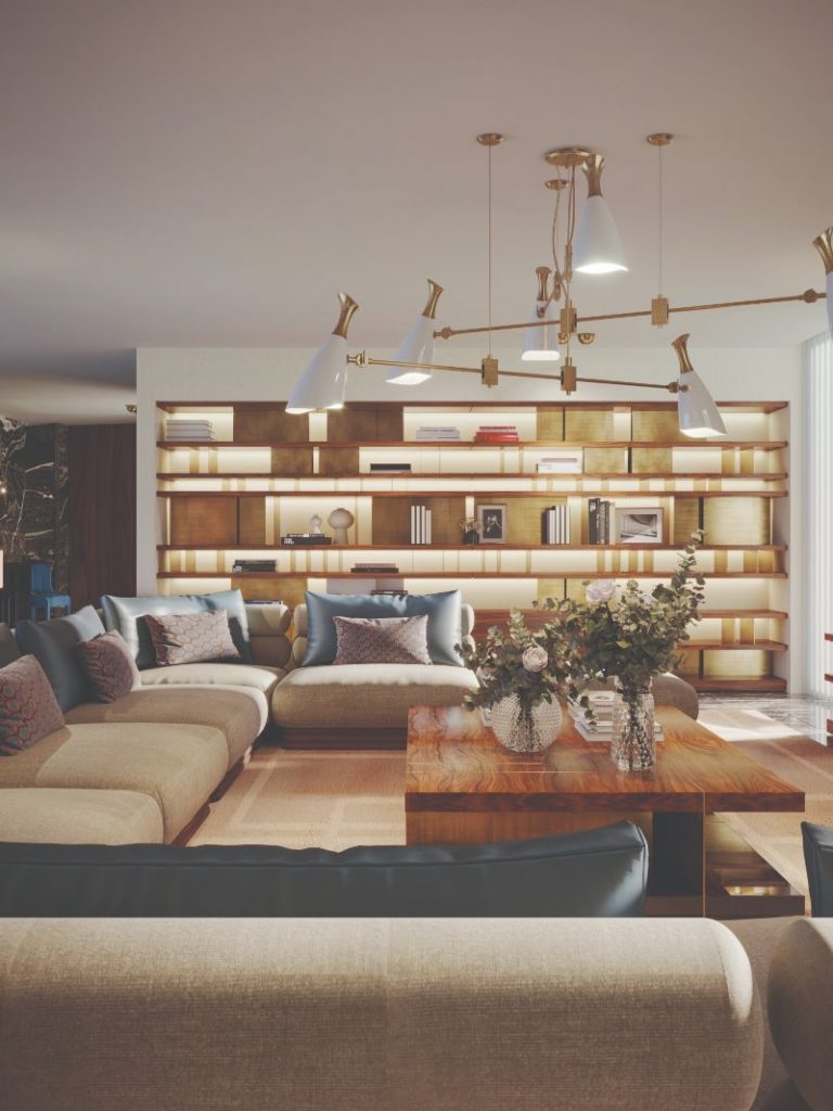 Unique Modern Rugs For Your Living Room, modern classic living room with modern Triology rug, black and gold center table, with golden supernova hanging light