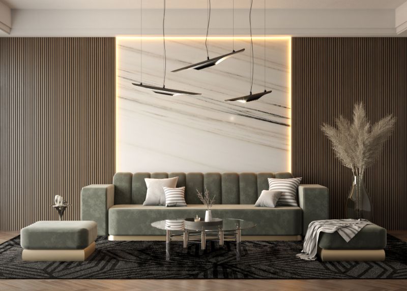 A modern classic living room with a three-dimensional gray rug, with a creative pattern that highlights the living room’s floors.